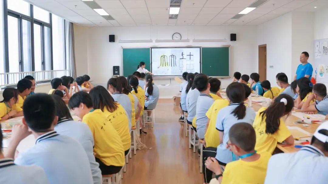 书法是中国汉字特有的一种传统艺术。汉字书法被誉为“无言的诗”“无行的舞”“无图的画”“无声的乐”。下午的书法课上,徐敏怡老师带领同学们一起走进书法五体之一的篆书世界。通过展示秦代篆书刻石的拓片、介绍秦代篆书的基本笔画和结构、讲解并示范例字、组织观摩和巡回指导等方式,徐老师讲解中国汉字文化,营员们练习书写基本笔划。