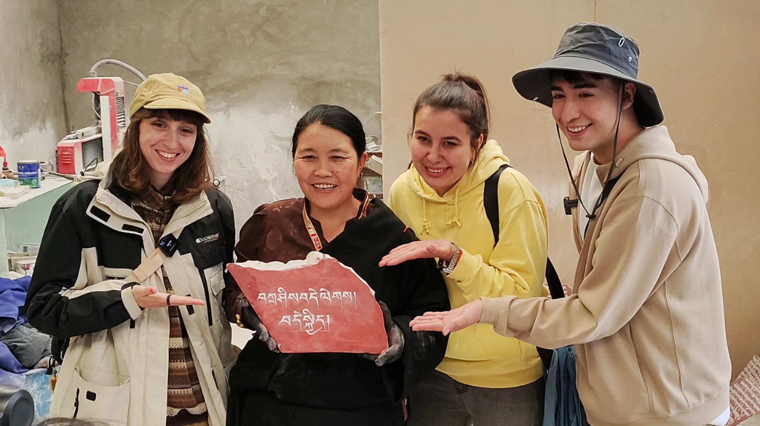 来到玉树的“歪果仁们”在石刻的文化魅力下跃跃欲试,跟随玛尼石刻非遗传承人体验了藏族古老传统手工技艺的魅力,和传承人共同完成了“扎西德勒 幸福快乐”玛尼石,并收到传承人的祝福。