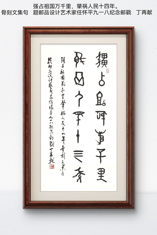 这两则故事,引起了丁再献先生的极大兴致,遂集东夷骨刻文字撰写楹联一副以示纪念,并用丁先生破译并首创的骨刻文书法成一幅艺术作品,今日推出,以飨读者!