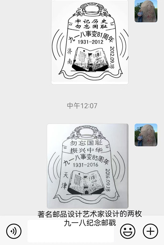 中国华侨传媒网讯:昨天是九一八事变93周年纪念日,著名文化学者丁再献先生,先是收到著名邮品设计艺术家任怀平大师转来老人家亲自设计的两枚九一八事变纪念邮戳,分别为2012年9月18日和2016年9月18日设计并发表。虽然是历史回顾,但仍具历史意义和重要的现实意义。