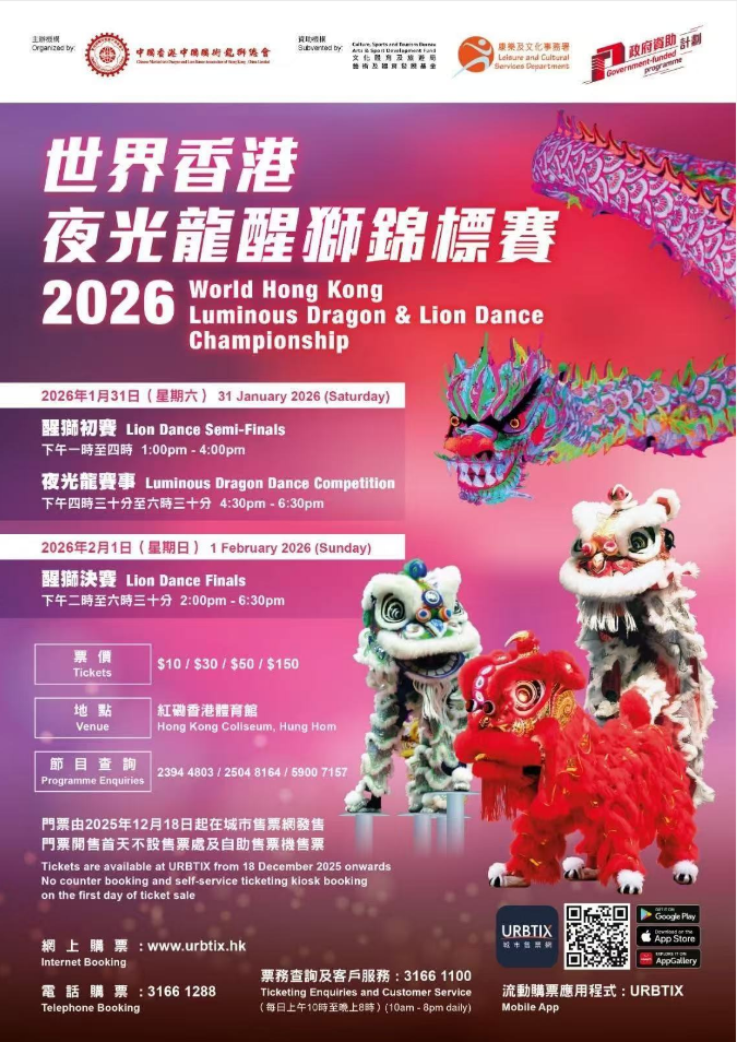财视澳洲讯|由中國香港中國國術龍獅總會主辦,並獲得民政事務局(藝術及體育發展基金)及康樂及文化事務署資助的第十六屆世界龍獅爭霸戰——「世界香港夜光龍・醒獅錦標賽2026」,將於2026年1月在紅磡香港體育館隆重舉行。