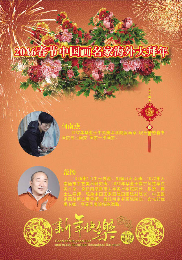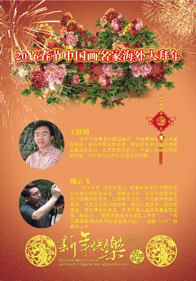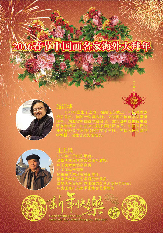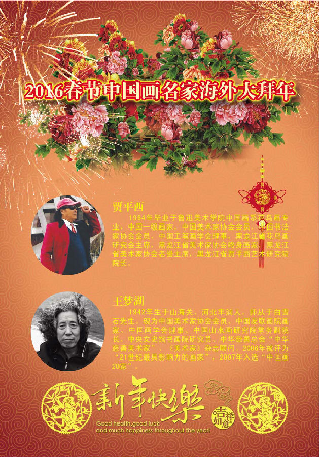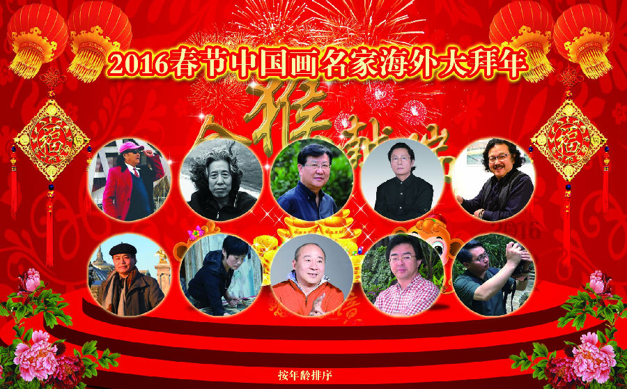 2016年春節之際,中國畫名家賈平西、王夢湖、蕭平、易洪斌、施江城、王玉良、何南燕、範揚、王世利、魏雲飛(按年齡排序)給全球華僑華人同胞大拜年。祝海外華僑華人同胞新年快樂,猴年吉祥,萬事如意!