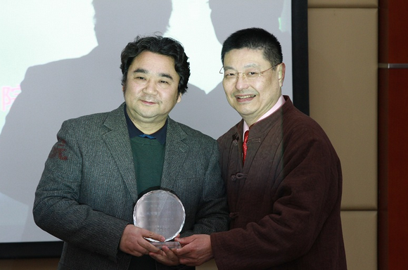 海峡两岸音乐交流协会理事长郭孟雍(右)为李仲党(左)颁发“海峡两岸音乐交流贡献奖