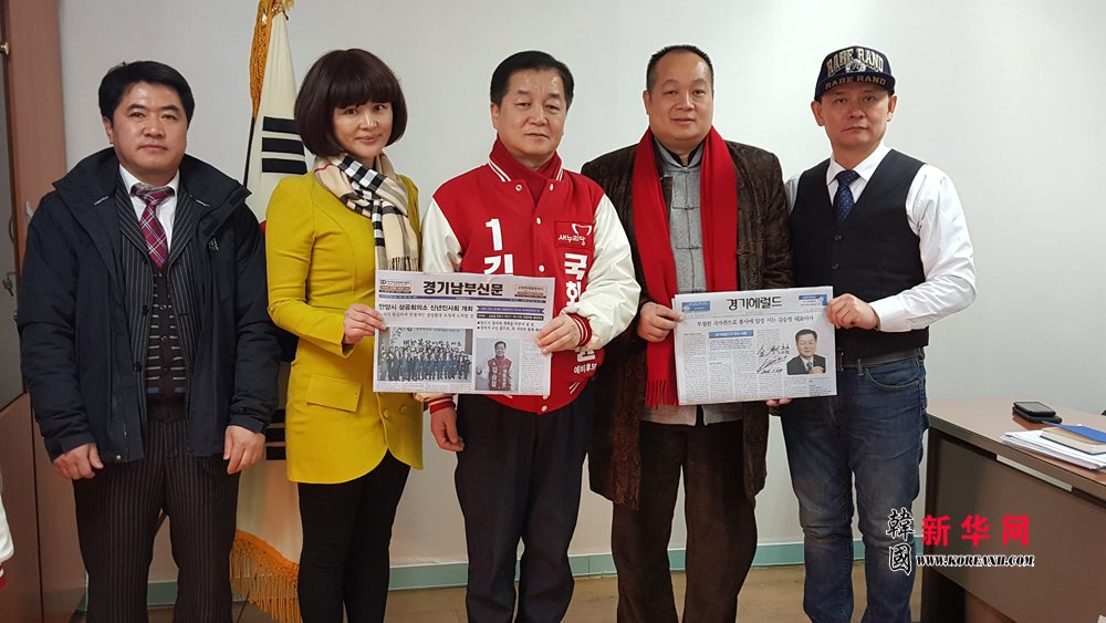 韩国执政党新国家党中央委员会委员长、现以执政党指定以1号候选人身份出马竞选京畿道安阳市国会议员的金承喆先生(中)、中国著名导演、海外华文新媒体合作委员会联合主席兼秘书长、韩国执政党中央委员会韩籍中国同胞专门委员会名誉委员长、韩国新华报业集团执行董事长陈俊余(右二)、《焦裕禄在洛矿》影片女主角李姿锐(左二)、韩国执政党新国家党中央委员会中国同胞专门委员会委员长、韩国全国韩籍华人总联合会总会长、韩国新华报社社长曹明权(右一)、韩国执政党新国家党中央委员会中国同胞专门委员会副委员长、韩国全国韩籍华人总联合会副总会长裴文锡(左一)等人座谈会后合影留念。