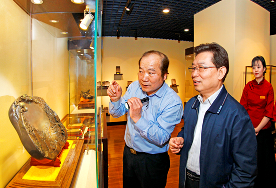 中宣部原秘书长、中国政研会副会长官景辉在中国工艺美术大师、中国文房四宝制砚艺术大师、中国文房四宝协会副会长梁佩阳的陪同下参观北京王府井工美大厦“紫云天工端砚艺术馆”