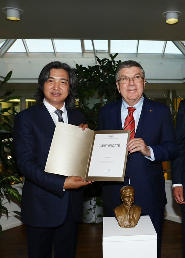 国际奥委会主席托马斯·巴赫向吴为山颁发荣誉证书
