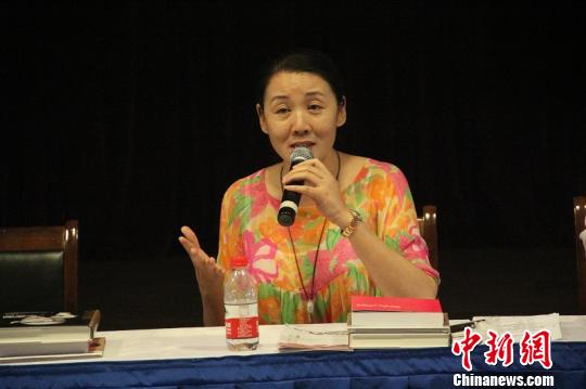 韩再芬向17国海外文化侨社负责人介绍黄梅戏赵强摄中新网安庆8月23日电(仕学龙赵强)“文化中国之旅·安徽行”黄梅戏剧文化交流座谈会23日在安徽安庆举行,来自17个国