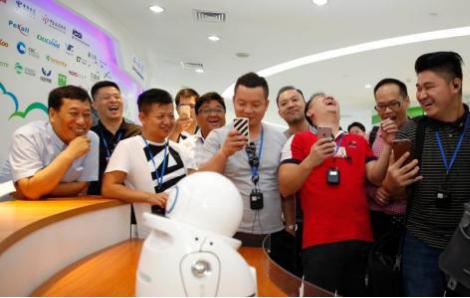 7月11日,华裔杰出青年代表与智能机器人互动。近日,由中国国务院侨务办公室和中国海外交流协会举办的第十一届世界华裔杰出青年华夏行北京线活动启动。来自30个国家和地区(含港澳)的近90名华裔杰出青年代表赴天安门城楼、故宫、前门、长城等地参观考察。