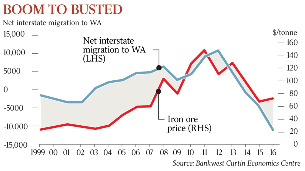 科廷的研究人员表示,西澳人才外流的情况将持续,因为已有图表显示,西澳主要大宗商品铁矿石价格的上涨已不能继续挽留人才。科廷大学(Curtin University)劳动经济学专家卡塞斯(Rebecca Cassells)指出,此前州际人口迁移与铁矿石价格之间存在一种相关关系,即若铁矿石价格上涨,西迁人口数量也将增加,但这种联系已被割裂。