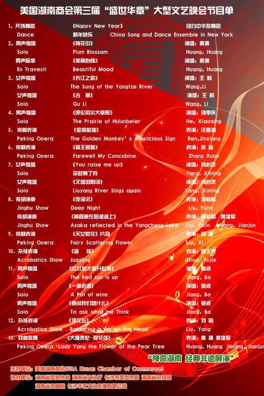 第三届《盛世华章》大型文艺晚会的主题为“湖南非物质文化遗产走进美国”,由美国湖南商会主办,由湖南省委宣传部、湖南省文化厅、长沙市委宣传部、湖南省杂技团、湖南省京剧团、长沙华艺文化传播有限公司协办,此次晚会也得到国会众议员孟昭文办公室、纽约市议员顾雅明办公室以及纽约中华歌舞团等其他机构与个人的大力支持。