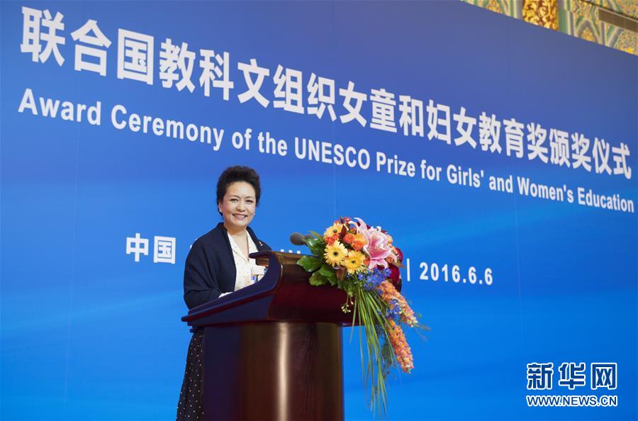 6月6日,首届联合国教科文组织女童和妇女教育奖颁奖仪式在北京人民大会堂举行。中国国家主席习近平夫人、联合国教科文组织促进女童和妇女教育特使彭丽媛出席颁奖仪式并致辞。新华社记者谢环驰摄