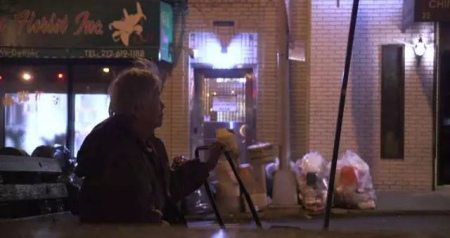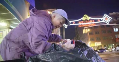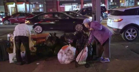 冬日的夜晚,她蹒跚地走在街头,推着一部小型手推车,在垃圾堆里挑拣起了尚可食用的面包。