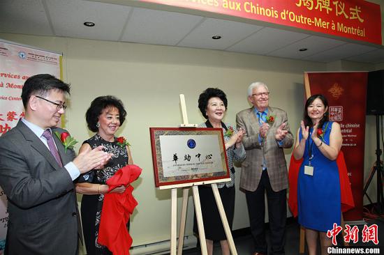 加拿大蒙特利尔的满城华人服务中心被中国国务院侨务办公室授予了“华助中心”。在当地时间22日举行的揭牌仪式上,到访蒙特利尔的国侨办主任裘援平(右三)为其授牌。图为揭牌仪式现场。中新社记者 徐长安 摄