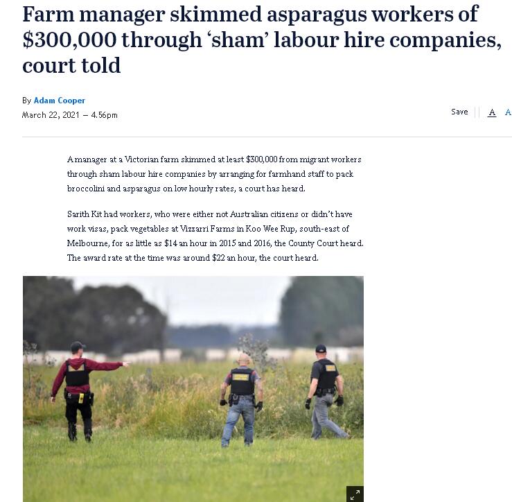 维州一家农场主通过皮包公司以低时薪雇佣海外劳工,并至少骗取了30万元的工资。如今该农场主正面临指控。《时代报》22日报道,法院得知,2015年和2016年,基特(Sarit