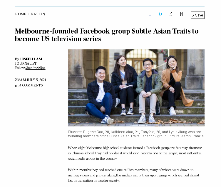 3年前,当8名墨尔本高中生某个周六下午在一所中文学校里成立了社交媒体“脸书”(Facebook)小组——“微妙亚洲特征”(SubtleAsianTraits,以下简称SAT)时,他们并没有