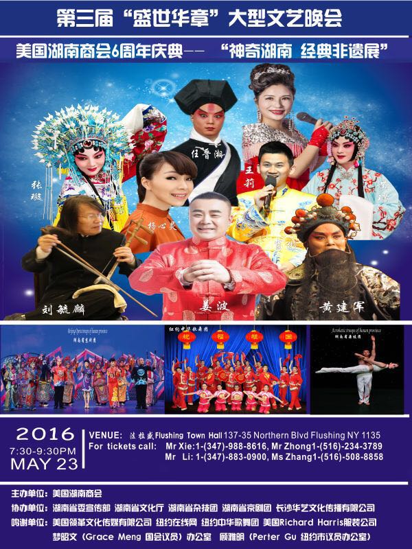 第三届《盛世华章》大型文艺晚会暨美国湖南商会成立六周年庆典于5月23日在法拉盛市政厅举办,高水平的节目让在座观众非常感动与震撼,实现了民众在海外欣赏中国艺术