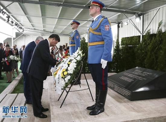 当地时间6月17日下午,刚刚抵达贝尔格莱德开始对塞尔维亚进行国事访问的国家主席习近平和夫人彭丽媛首先前往中国驻南联盟被炸使馆旧址,凭吊在使馆被炸事件中英勇牺