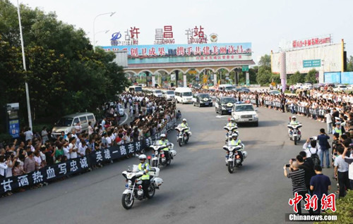 7月20日15时15分,搭载有中国赴南苏丹维和遇袭伤亡人员的军机抵达郑州新郑国际机场。在机场举行简短而庄重的迎接仪式后,灵车载着维和牺牲烈士李磊、杨树朋的灵柩前