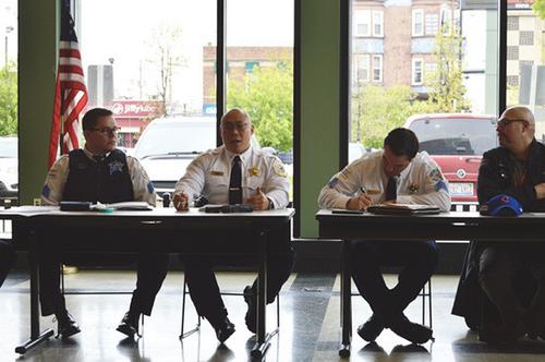 芝加哥警局第九警分局局长张志强(左二),在华埠治安会上指出,自华埠小区成立义警巡逻队以来,治安情况获很大改善,希望民众不要过分担心。(美国《世界日报》/董宇摄