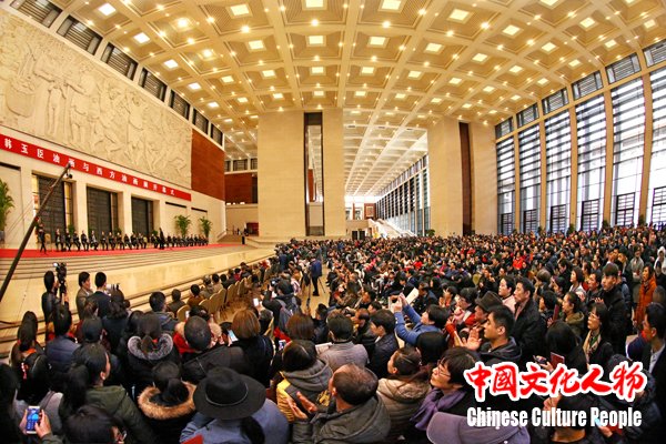 中国文化人物(主编 王保胜)12月9日,由中国艺术研究院、中国国家博物馆和河北省文学艺术联合会共同主办,中国国家画院油画院担任学术支持的“韩玉臣油画与西方油画展”在中国国家博物馆隆重开幕。中国艺术研究院院长连辑,中国国家博物馆馆长吕章申,中国美术家协会分党组书记、驻会副主席、秘书长徐里,中央美术学院院长、中国美术家协会副主席范迪安,国家画院油画院院长詹建俊,中央美术学院教授、此次展览策展人邵大箴,中央美术学院教授钟涵,韩玉臣恩师、中央美术学院教授苏高礼,商务部原副部长张志刚,河北省政协原副主席刘建生,国家工商总局原副局长付双建,全国人大常委会委员、中国工程院院士丛斌,河北省政协秘书长郭大建,国家图书馆原馆长詹福瑞,中央编办原副主任王澜明,全国政协常委彭雪峰,河北省文联党组书记解晓勇,中国书法家协会副主席、河北省文联副主席刘金凯,河北省文联副主席、河北省美术家协会主席祁海峰,中国国家画院油画院常务副院长张祖英,中国艺术研究院中国油画院副院长、中国美术家协会油画艺术委员会秘书长徐青峰,人民日报海外版党委书记李建兴,中国摄影家协会原副主席朱宪民等领导,以及阿拉伯国家驻华使节委员会主席阿卜杜拉·萨阿迪及其夫人,卡塔尔驻华大使苏尔坦·曼苏里及夫人,中央美术学院副院长董长侠、教授孙景波,中国艺术研究院研究员陈醉、王镛、杨华山、尹毅等来自海内外文化界、艺术界的专家学者和各界嘉宾两千余人出席。开幕式由中国国家博物馆副馆长谢小铨主持。