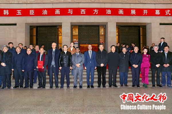 中国艺术研究院院长连辑,中国国家博物馆馆长吕章申,中国美术家协会分党组书记、驻会副主席、秘书长徐里,中央美术学院院长、中国美术家协会副主席范迪安,国家画院油画院院长詹建俊,中央美术学院教授、此次展览策展人邵大箴,阿拉伯国家驻华使节委员会主席阿卜杜拉·萨阿迪,卡塔尔驻华大使苏尔坦·曼苏里等来自海内外文化界、艺术界的专家学者和各界嘉宾与韩玉臣合影,祝贺“韩玉臣油画与西方油画展”成功举办