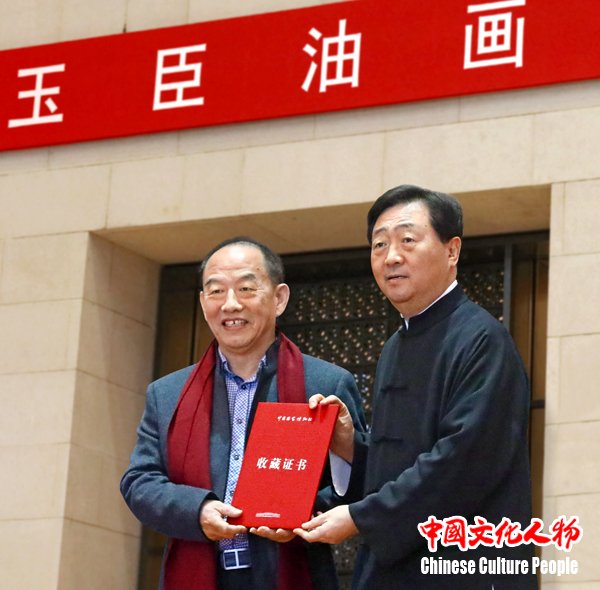 开幕式上,中国国家博物馆馆长吕章申向韩玉臣颁发了国博收藏其《信仰的力量》和《大山深处》两幅油画作品的证书。