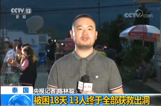 央视记者 陈林聪:12名少年足球队队员和一名教练员在经过18天溶洞围困之后,在10号当地时间傍晚6点47分终于被全部解救出来了。刚才在现场我们可以看到,现场数百名记者在现场响起了热烈的掌声,来庆祝这次成功的解救行动。