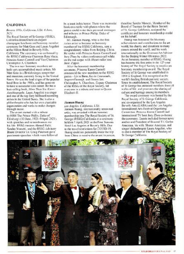 2021年8月出版的《英国圣乔治》杂志,发表了一篇关于英国圣乔治皇家学会(RSSG)首位亚洲艺术家荣誉会员、比佛利LABA艺术节首位蓝筹股艺术家黄建南的专题报道,引发强烈反响。该杂志的封面刊登了爱丁堡公爵菲利普亲王的照片,并对他的一生表示敬意。