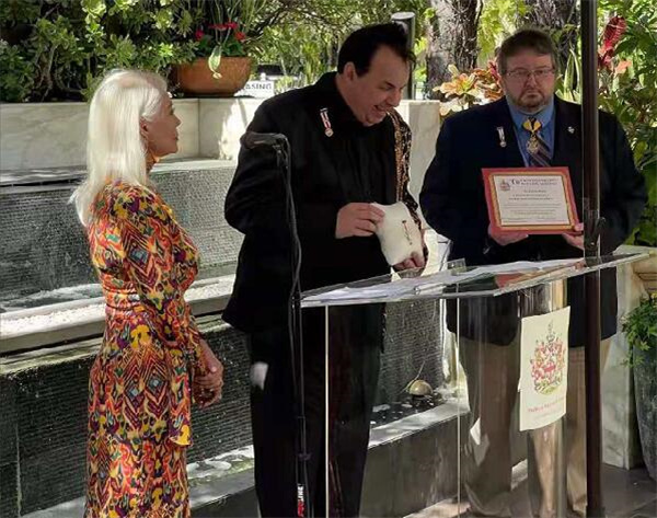 文章还对授荣仪式作了报道。报道说,授荣典礼由英国圣乔治皇家学会加州分会主办,洛杉矶比佛利艺术学院(LABA)和洛杉矶国际艺术节组委会协办。英国皇家学会加州分会主席、英国皇家公主凯伦·坎特雷尔(Princess Karen Cantrell)和著名国际电视主持人周正(Joey Zhou)共同主持了仪式。