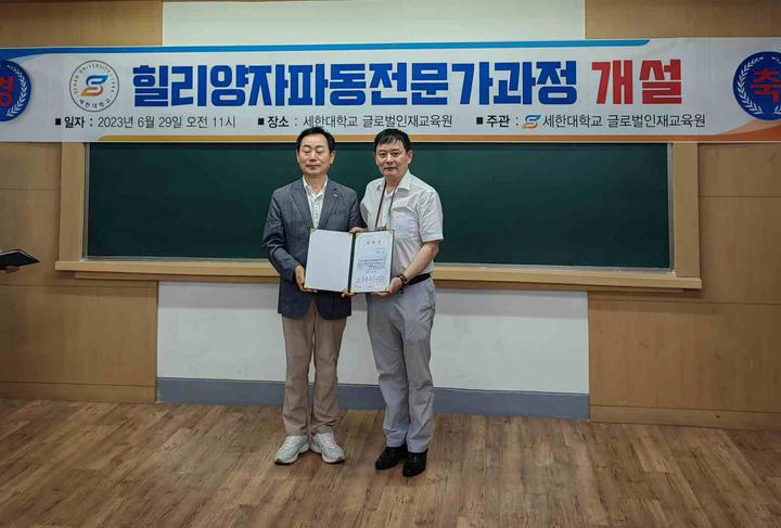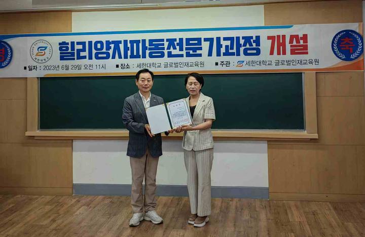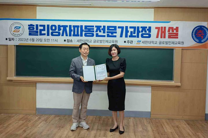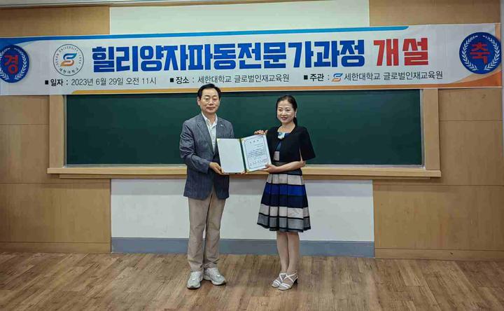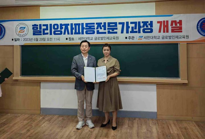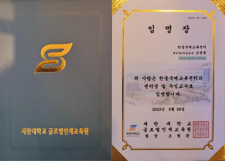 世界侨报讯(记者:艳玲 摄影:茂娥 )2023年6月29日,韩国世翰大学国际人才教育学院设立了韩中国际交流中心,韩中新闻记者协会会长兼韩国新华报社社长曹明权博士被韩国世翰大学聘任为中心主任兼教授。