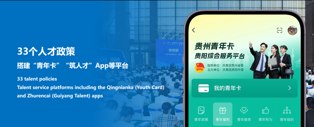 我们打造创新创造舞台,让青年迸发青春活力。贵阳被誉为“中国数谷”,是全球集聚超大型数据中心最多、全国承载大数据领域试点示范最多的城市之一。我们致力于打造全国数字经济技术模式、商业模式的首选试验田,建设“数字活市·青创未来”为特色的青年发展型城市生态,出台编制外引进高层次人才独立薪酬、鼓励科研人员兼职创新创业、产业人才互动招引“123”计划等一系列人才政策,搭建“青年卡”“筑人才”App等平台,让青年纵情遨游数字经济蓝海,在大数据领域创造属于自己的理想地!