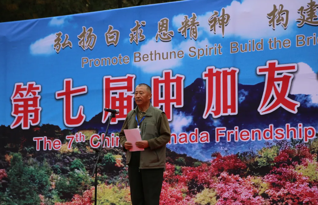中国白求恩精神研究会执行会长陈天平首先代表主办方讲话。他指出:自2018年以来,“白银坨中加友谊枫叶节”已成功举办了六届。每一届尽管形式各异,内容不同,但主题始终如一,那就是以枫叶为媒,让海内外更多的人走进白银坨,走近白求恩,加强交流,增进友谊。自枫叶节举办以来,得到了中加政府和民间有识之士的高度赏识和青睐,关注度和参与度越来越高,特别是在白求恩的故乡,影响力和知名度也越来越大,来自加拿大政府、大使馆、加中友协的相关人员曾多次出席活动,加拿大总理特鲁多还曾专门发来贺信。可以说,“白银坨中加友谊枫叶节”已成为加强中加交流与了解的窗口,增进信任与合作的平台,深化两国人民友谊的见证和打造红色旅游国际化品牌的重要举措。