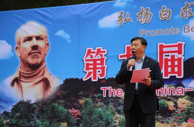 开幕式由中国人民大学教授、博士生导师,北京市人民政府参事室文史馆馆员、北京市政协委员殷强主持,他向来自中国、加拿大两国政府部门、民间团体的领导、将军、专家学者、中加国际友好人士和北京、河北等地党史研究、医院、大学、旅游部门的领导,以及顺平县、神南镇和附近乡村的干部群众,各大媒体记者表示热烈欢迎和衷心感谢!他指出,本次活动旨在纪念白求恩医生在华逝世85周年,弘扬白求恩精神,延伸中加友谊的纽带,打造国际化红色旅游品牌,促进中加两国人民的交往和友谊。