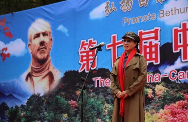 加拿大当代白求恩行动促进委员会会长马楠接着讲话,她深情回顾了白求恩大夫援华期间的光辉事迹,介绍了加拿大当代白求恩行动促进委员会成立以来开展活动的情况,最后表示要继续为推动广泛开展学习白求恩活动和增进中加友谊做贡献。