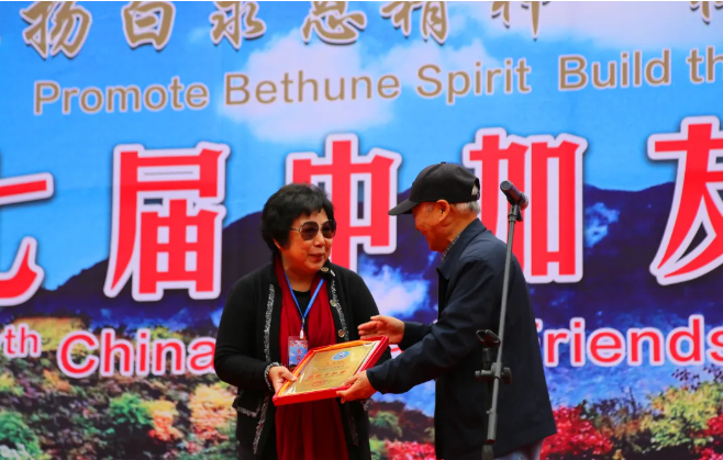 中国白求恩精神研究会原名誉会长栗龙池代表中国白求恩精神研究会向马楠会长颁发了“弘扬白求恩精神特别贡献奖”。