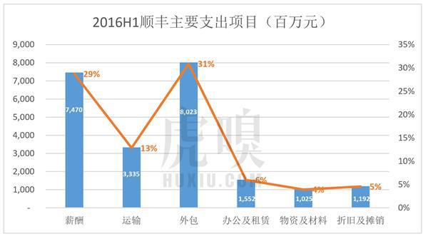 这在财务数据上展示的再明白不过,去年上半年,顺丰的各项成本、费用占总营收的90%,其中薪酬支出就达到74.7亿,占营收的29%,是出了外包(干线运输、输单收派仓管、中转装卸等)这项成本外的第二大支出。