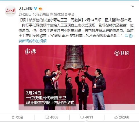 同样以低调著称的王卫在群众心中的形象则一直很正面,“有情有义”,“好老板”,“逆袭典范”等等这样的评价,堪称路人缘好到爆。甚至连人民日报在转载报道顺丰上市敲钟消息的时候,都带上了王卫去年霸气维护自家被掌掴的快递员,刷屏各大媒体的壮举。