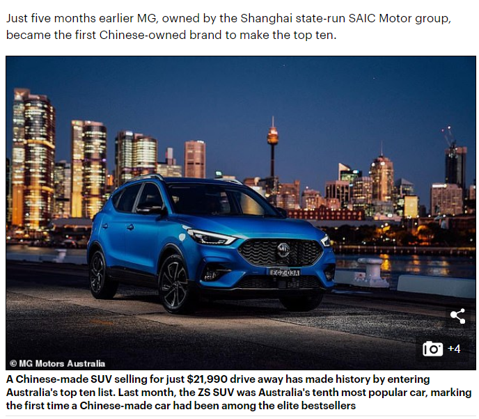 联邦汽车行业协会(FCAI)近日发布的7月数据显示,售价仅2.199万澳元的一款名爵(MG)SUV车系创造了历史,成为首个进入澳洲销量前10名的中国国产车。