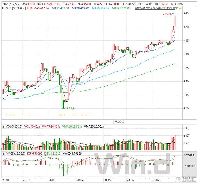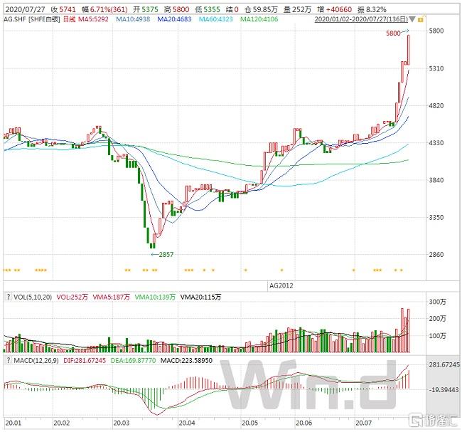 当日外盘方面,现货黄金突破1940美元/盎司,日内涨超2%,继续刷新历史新高。现货白银暴涨7%,续创7年新高至24.385美元/盎司。