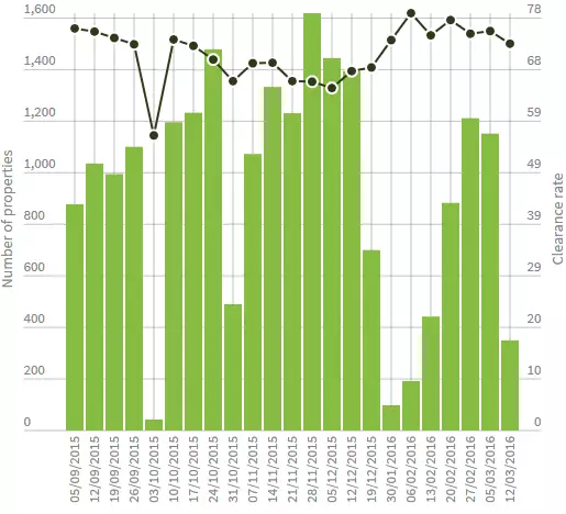 黑色为清盘率,绿色为房屋数量)尽管受到劳动节长周末假期的影响,房市处于暂停模式,但是上周六的拍卖结果仍非常可观,为复活节前的房屋拍卖奠定了非常坚实的基础。周