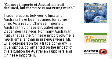 澳中贸易关系已经紧张了一段时间。自去年12月以来,中国从澳洲进口的水果经历了一些波折。和往年相比,中国进口的许多澳洲水果量都有所减少。对此,广州一家贸易公司的发言人李先生近日就此发表了看法。