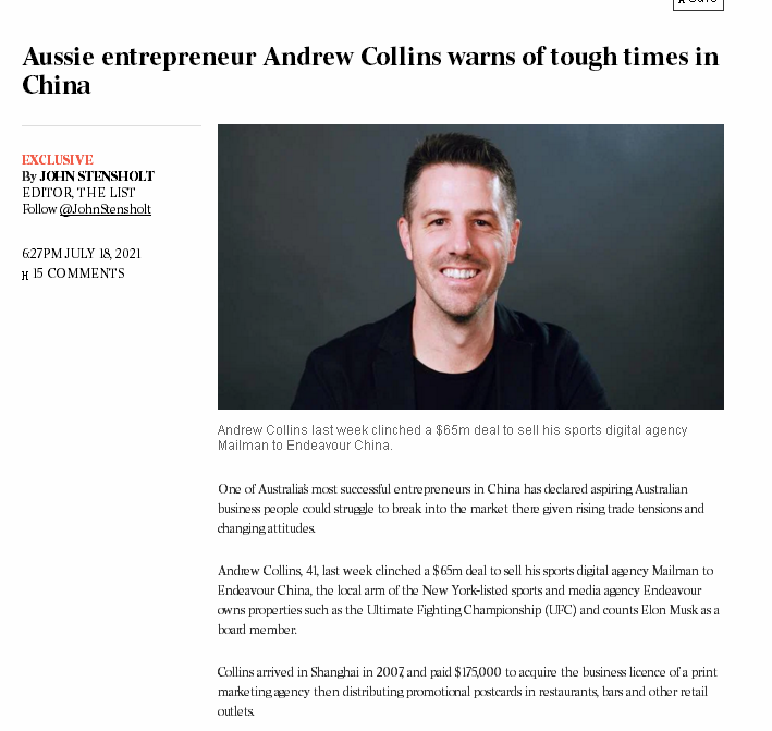 作为在中国最成功的澳洲企业家之一,41岁的柯林斯(Andrew Collins)在上周敲定了一笔价值650万美元的交易,将自己的体育数字广告公司Mailman出售给奋进中国(Endeavour China)。奋进中国是在纽约上市的体育和媒体公司奋进(Endeavour)的中国子公司,旗下拥有终极格斗冠军赛(Ultimate Fighting Championship,简称UFC)等赛事,特斯拉汽车首席执行官马斯克(Elon Musk)也是奋进中国的董事会成员。