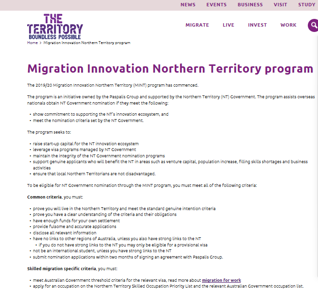 澳大利亚北领地州政府和达尔文创新中心(Darwin Innovation Hub,DIH。系Paspalis Asset Management Pty Ltd,PAM的全资子公司,澳大利亚北部地区唯一的创新产业孵化器)共同成立Paspalis Innovation Investment Fund (PIIF),通过Migration Investment Northern Territory(MINT)计划吸引投资人/移民申请人参加,在获得190/491签证的州政府担保的同时,为PIIF基金吸引投资。