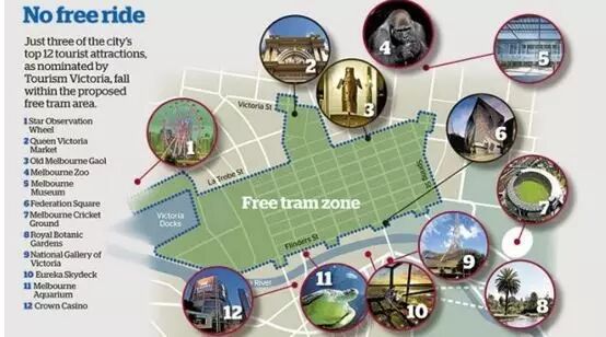 在墨尔本的市中心穿梭无疑是既便捷、省时,又节省出行成本的。有轨电车免票区长达240公里,环绕穿梭于各条主要街道,例如,伊丽莎白街(Elizabeth Street),福林德斯街(FlindersStreet),以及哥林斯街(Collins Street)等;东向国会大厦(ParliamentHouse),南向重要交通枢纽福林德斯火车站(Flinders Street Station),西向著名景点维多利亚港湾(VictoriaHarbour),北向维多利亚女王市场(Queen Victoria Market)。