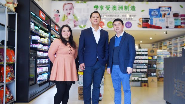 ITM董事陈强(KeongChan,音译)(中)与澳卖客公司联合创始人约书亚(JoshuaZhou)(右)、林恩(LynnZheng)(左)(《悉尼先驱晨报》图片)据《悉尼先驱晨报》报道,澳洲证券交