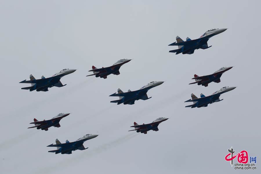 10月30日,记者在中国航展现场看到了已经抵达的俄罗斯勇士及雨燕飞行表演队进行联合演练。5架苏-27和4架米格-29战斗机先后起飞,在空中集结后演练了“库宾卡钻石”、“菱形”形等编队,以及“对头跌升急降”、“郁金花开”等飞行表演动作。