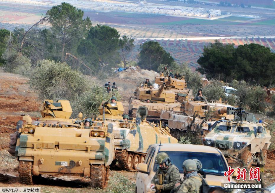 当地时间1月28日,土耳其部队在叙利亚攻击库尔德族武装成员的军事行动持续,并攻占一个富有战略价值的山头,激战令五十多名平民死亡。土耳其总统埃尔多安称,会清理接壤叙利亚的边境,显示军事行动规模可能扩大。图为占据阿夫林的布尔萨亚山头的土耳其部队。