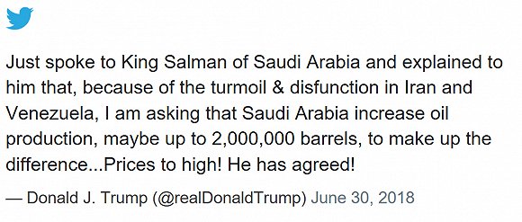 当地时间6月30日,美国总统特朗普在推特(43.67, -1.12, -2.50%)上公布说,他向沙特阿拉伯提出的大幅增加原油产量的要求已经获得了沙特国王萨勒曼的同意。