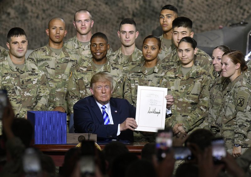 当地时间13日,美国总统特朗普在纽约德拉姆堡基地签署“2019年国防授权法案”授权7160亿美元国防开支。