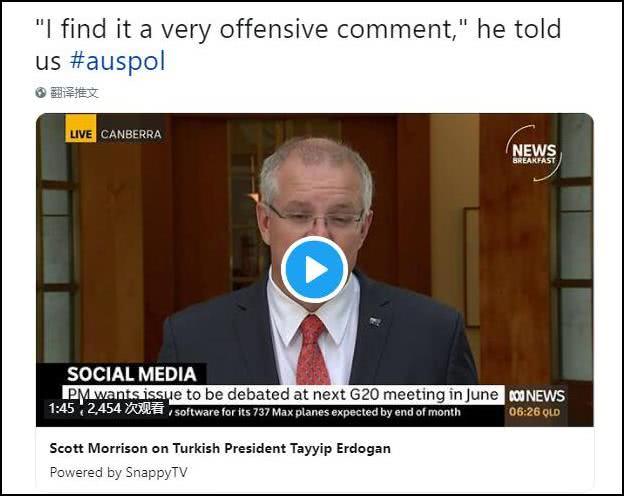 莫里森在议会前接受采访,厉声抨击埃尔多安,“我认为这是对澳大利亚人的高度冒犯,在这个非常敏感的环境下,这(埃尔多安的言论)非常鲁莽。”